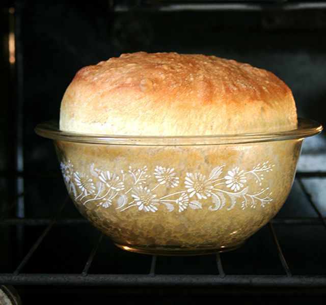 Hosszúkás vagy kerek alakúra formázzuk a tésztát, és egy nagyobb méretű (8 liter), sütőpapírral bélelt jénai tál aljába helyezzük, rátesszük a tetőt és duplájára kelesztjük.