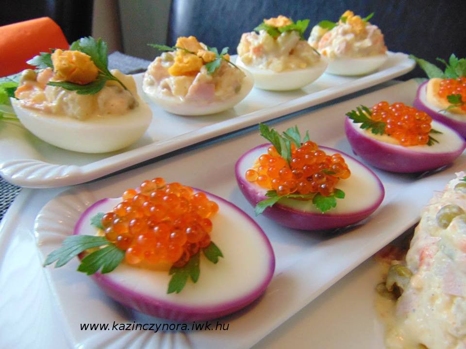 borssal,krémesre keverjük .és a tojásokba töltjük. Petrezselyemzölddel és kaviárral díszítjük