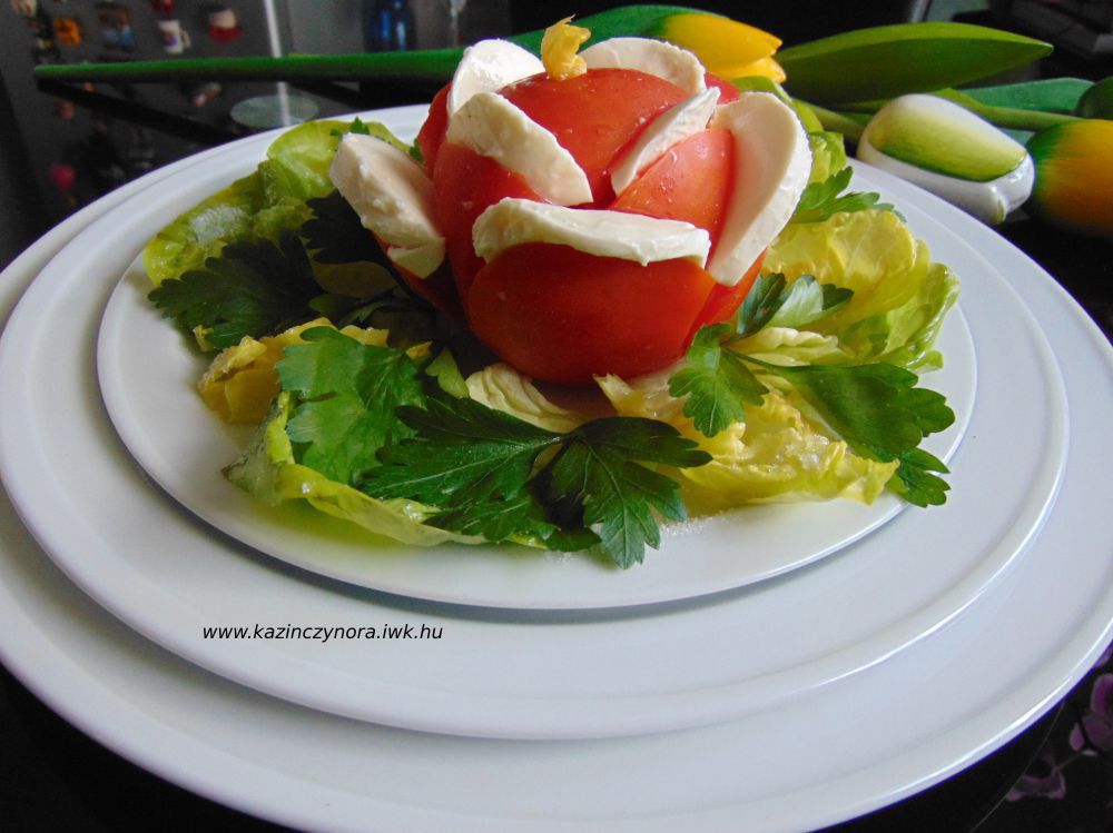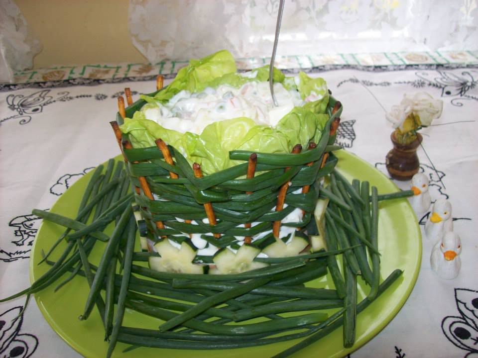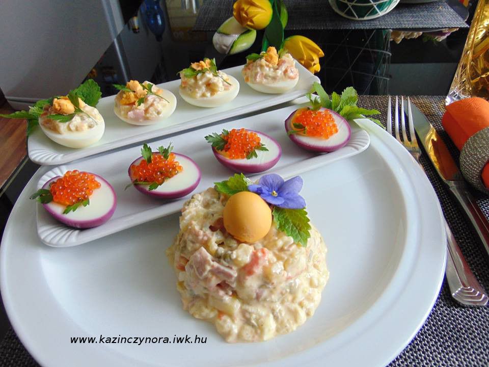salátával megtöltjük. Tetejét tojássárgájával pici snidlinggel díszítjük