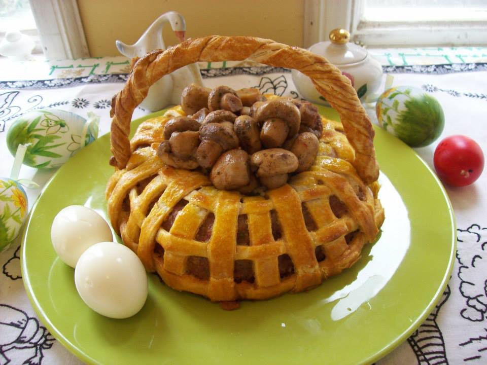 A leveles tésztát kinyújtjuk, apró csíkokra vágjuk, és kosárformát formázunk belőle. (Fontos, hogy a belseje üreges maradjon.) Először alulról felfelé rakjuk a csíkokat, ráhelyezzük a húst, majd hosszabb csíkokat vágunk és befonjuk a kosár (a fasírt) oldalát vele. Végül 4 hosszabb csíkot összesodrunk ez lesz a kosár füle. Az egészet lekenjük a tojássárgájával.