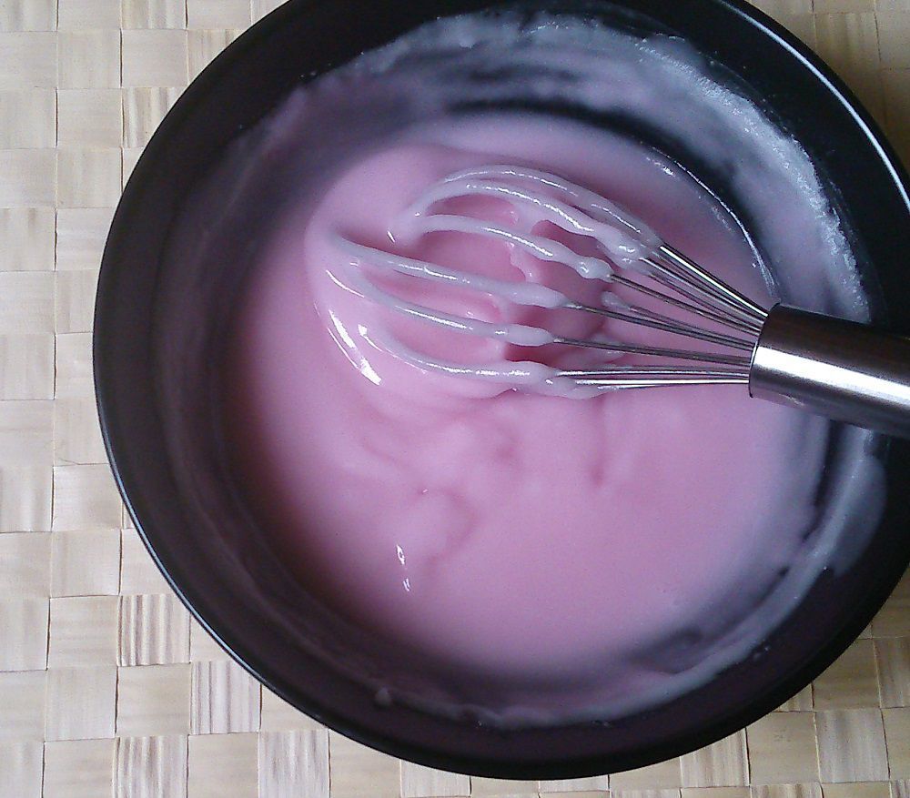 Ha színes mázat szeretnénk, egy-két csepp ételfestékkel színezhetjük is, ez látható a lap tetején lévő fotón.